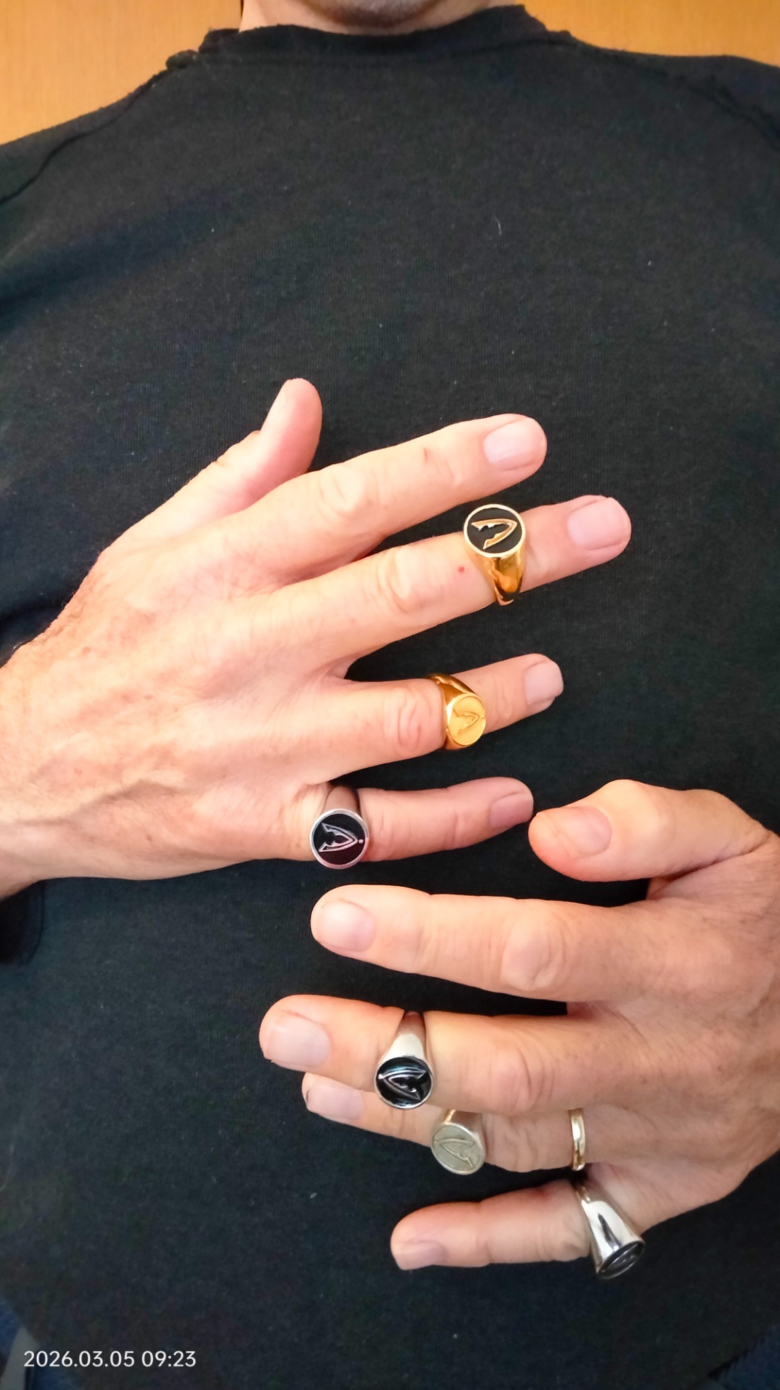 Om je een beter beeld te geven, heb ik een paar foto’s gemaakt van de Veteranen Zegelring 2026 op mijn eigen vinger. Zo zie je direct de verschillen in uitstraling en formaat.
